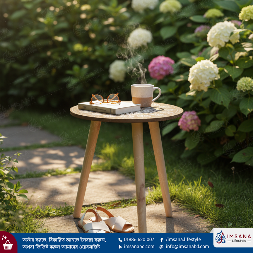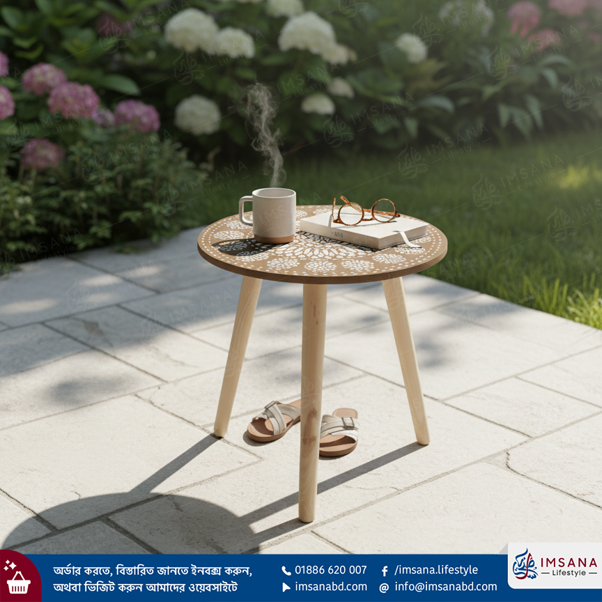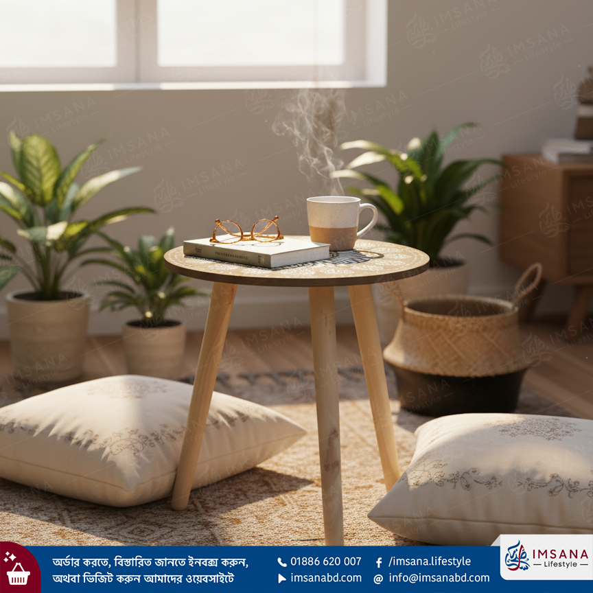 মজবুত ও টেকসই: টেবিলটির ৩টি পায়া তৈরি করা হয়েছে সিজনড কেরোসিন কাঠ (Charosin Wood) দিয়ে, যা ওজনে হালকা হলেও অত্যন্ত মজবুত এবং ঘুণপোকা প্রতিরোধী।