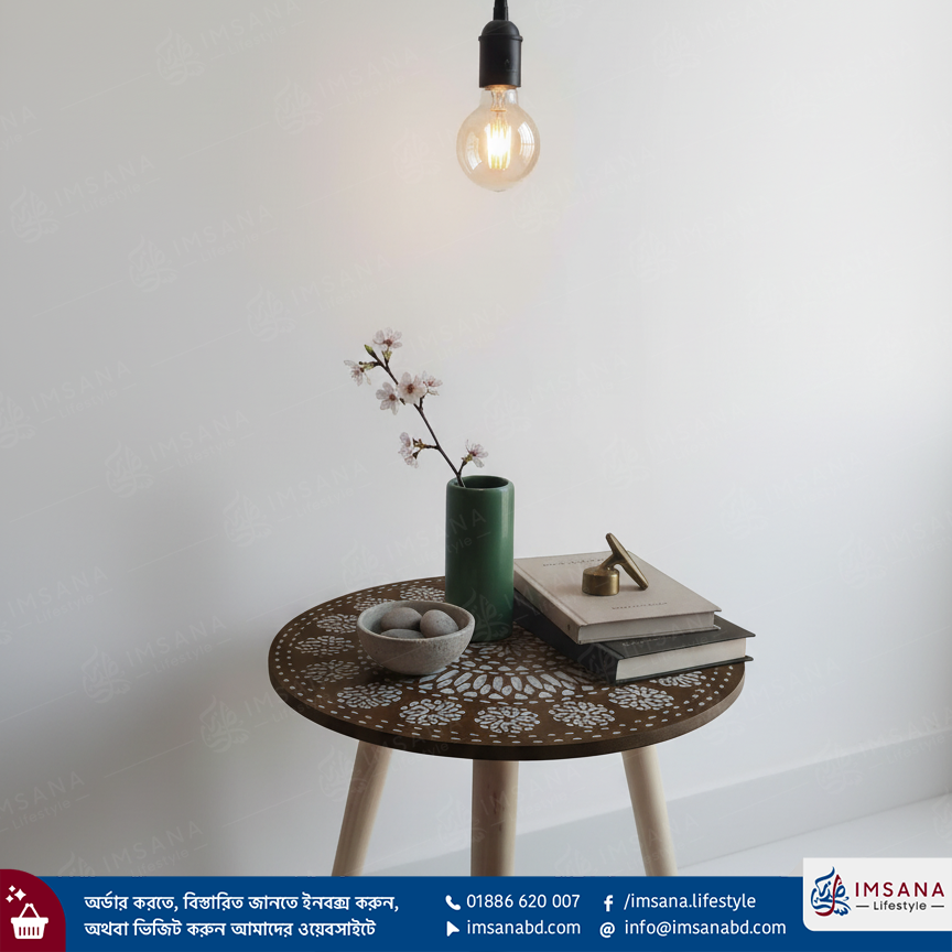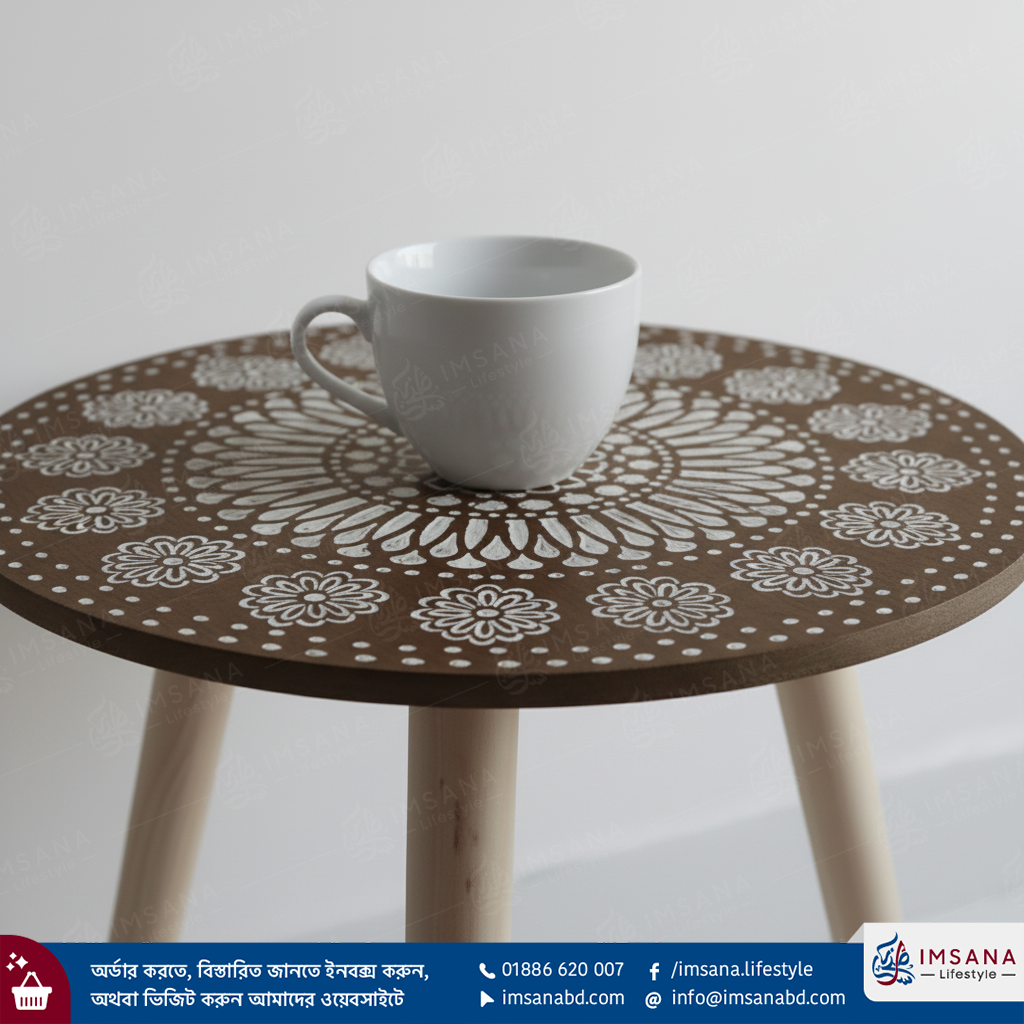 আর্টিস্টিক মান্ডালা ডিজাইন: মান্ডালা নকশা প্রশান্তি এবং সৌন্দর্যের প্রতীক। টেবিলের উপরের এই ডিজাইনটি যেকোনো সাধারণ কর্নারকে ফটোজেনিক (Photogenic) করে তোলে।
