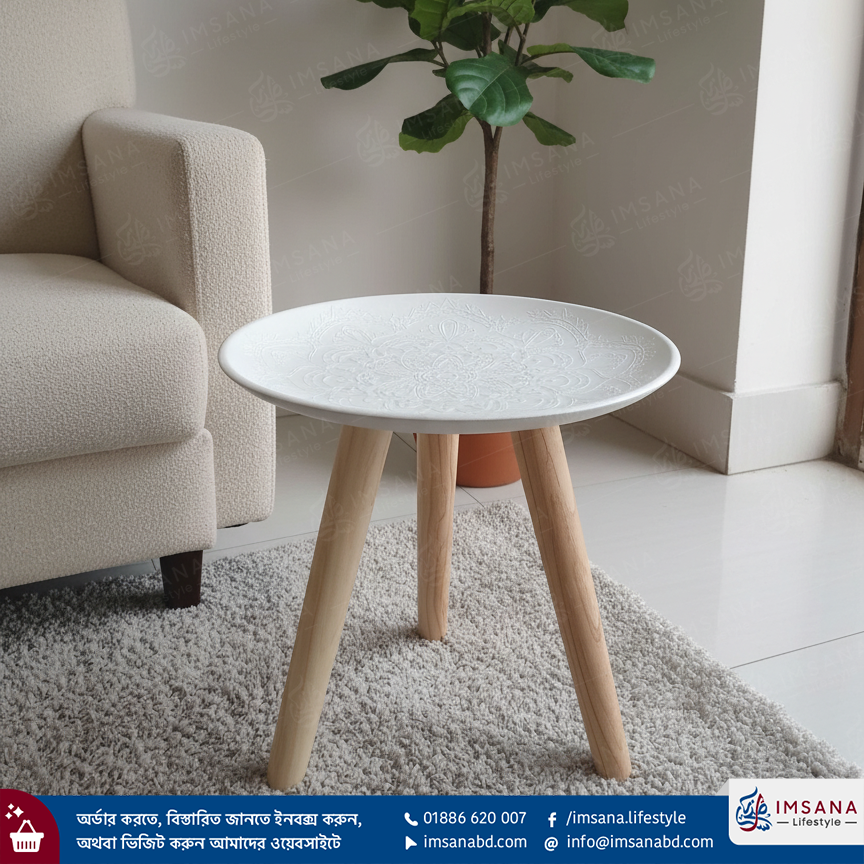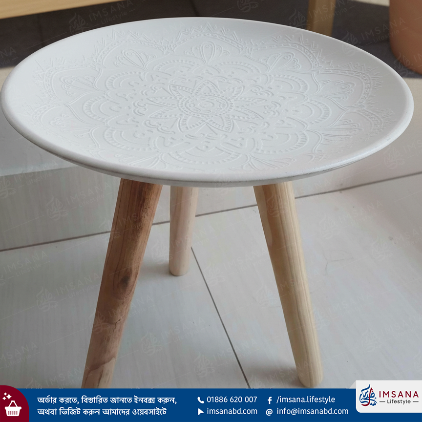 এই টেবিলটির প্রধান আকর্ষণ হলো এর টপে থাকা সূক্ষ টেক্সচারড ম্যান্ডালা (Mandala) ডিজাইন। এই এমবসড (embossed) নকশাটি টেবিলটিকে একটি সাধারণ আসবাবের থেকে বেশি, একটি শৈল্পিক পিস হিসেবে তুলে ধরে। এটি আপনার ঘরে একটি বোহেমিয়ান (Boho) এবং আধুনিকতার ছোঁয়া এনে দেবে।