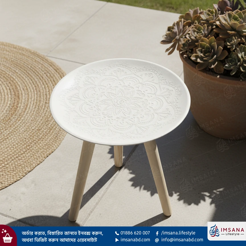 এই টেবিলটির প্রধান আকর্ষণ হলো এর টপে থাকা সূক্ষ টেক্সচারড ম্যান্ডালা (Mandala) ডিজাইন। এই এমবসড (embossed) নকশাটি টেবিলটিকে একটি সাধারণ আসবাবের থেকে বেশি, একটি শৈল্পিক পিস হিসেবে তুলে ধরে। এটি আপনার ঘরে একটি বোহেমিয়ান (Boho) এবং আধুনিকতার ছোঁয়া এনে দেবে।
